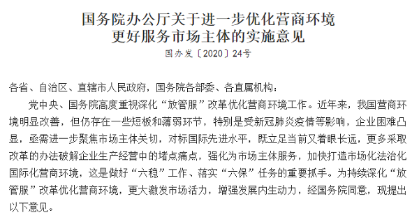 摘 要:国务院办公厅日前发布《关于进一步优化营商环境更好服务市场主体的实施意见》(以下简称《意见》)。